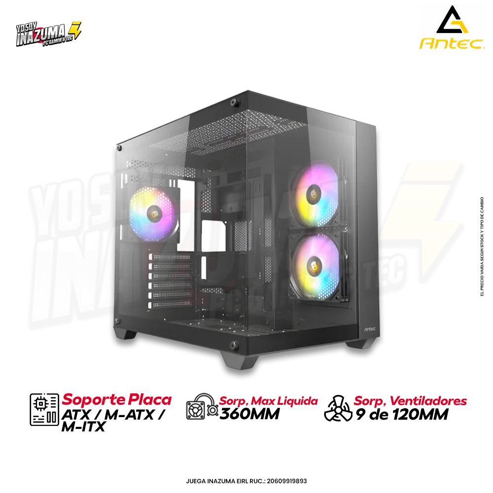 La Antec CX800 es una torre de formato Mid-Tower orientada al público gamer que busca diseño vistoso, buen soporte para hardware moderno e iluminación ARGB integrada. Las versiones CX800 ARGB o CX800 Wood ARGB ofrecen paneles de vidrio templado (frontal y lateral) que permiten exhibir el interior del sistema casi sin obstrucciones (“270° full-view”) y un diseño de doble cámara que separa componentes (placa madre / GPU) del módulo de fuente/cables para una gestión más limpia del flujo de aire.
