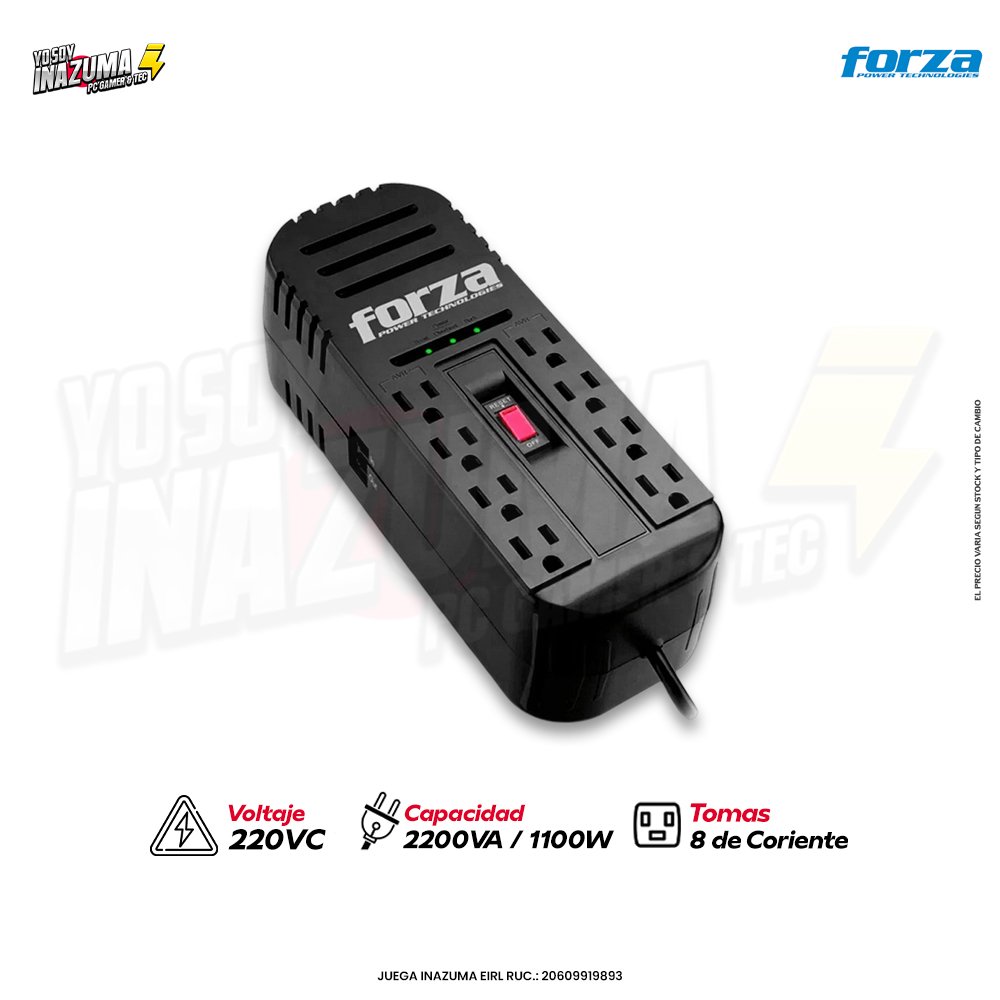 El Forza FVR-2202 es un estabilizador de voltaje profesional diseñado para proteger computadoras, periféricos y equipos electrónicos sensibles frente a fluctuaciones eléctricas, picos de tensión y ruido. Ofrece una potencia de 2200 VA (1100 W) y cuenta con 8 tomas NEMA 5-15R, ideales para conectar varios dispositivos de forma segura.