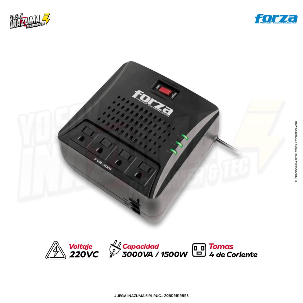 El Forza FVR-3002 es un regulador automático de voltaje (AVR) diseñado para proteger equipos electrónicos frente a fluctuaciones de tensión, picos de voltaje y caídas en la red. Su capacidad es de 3000 VA / 1500 W.